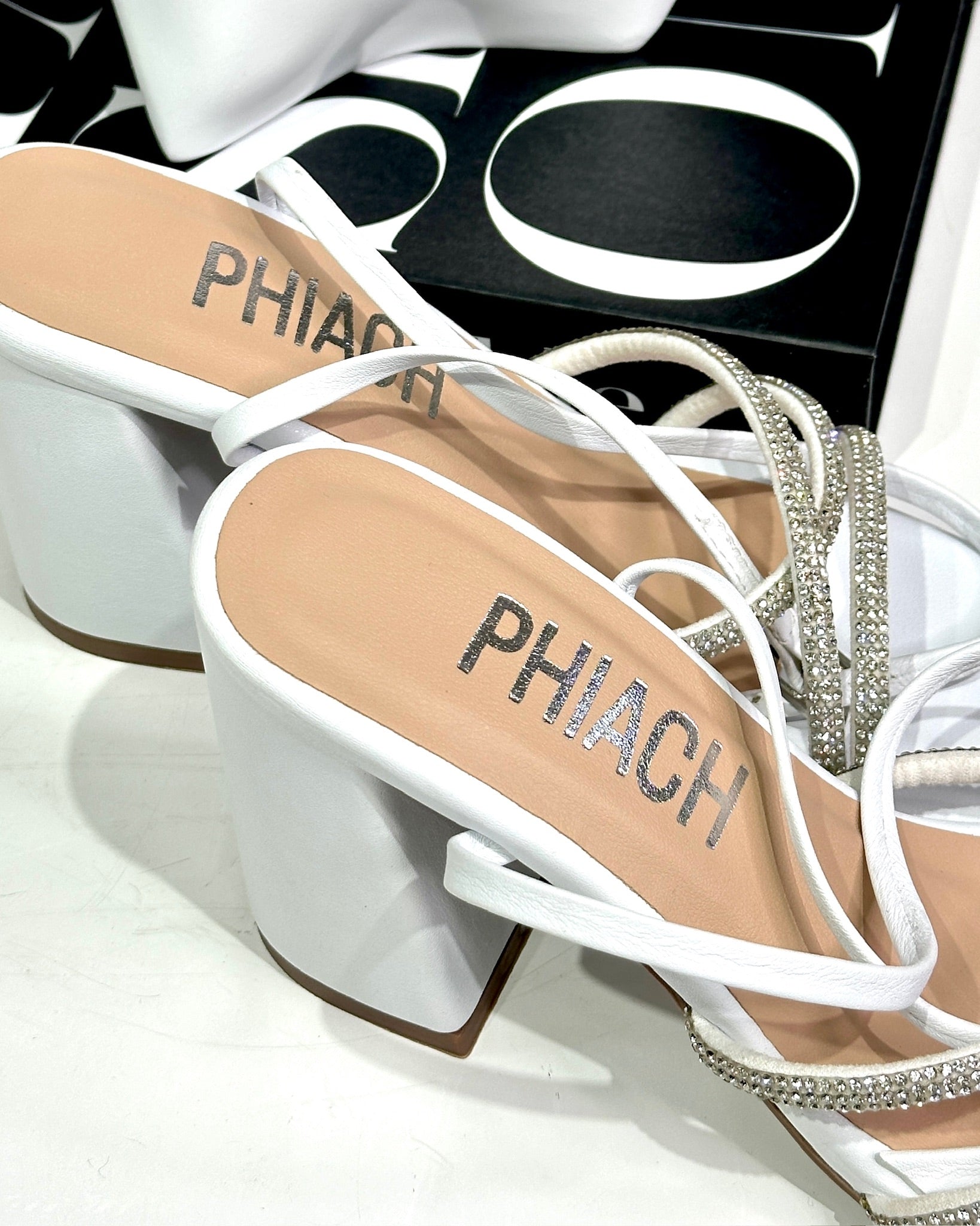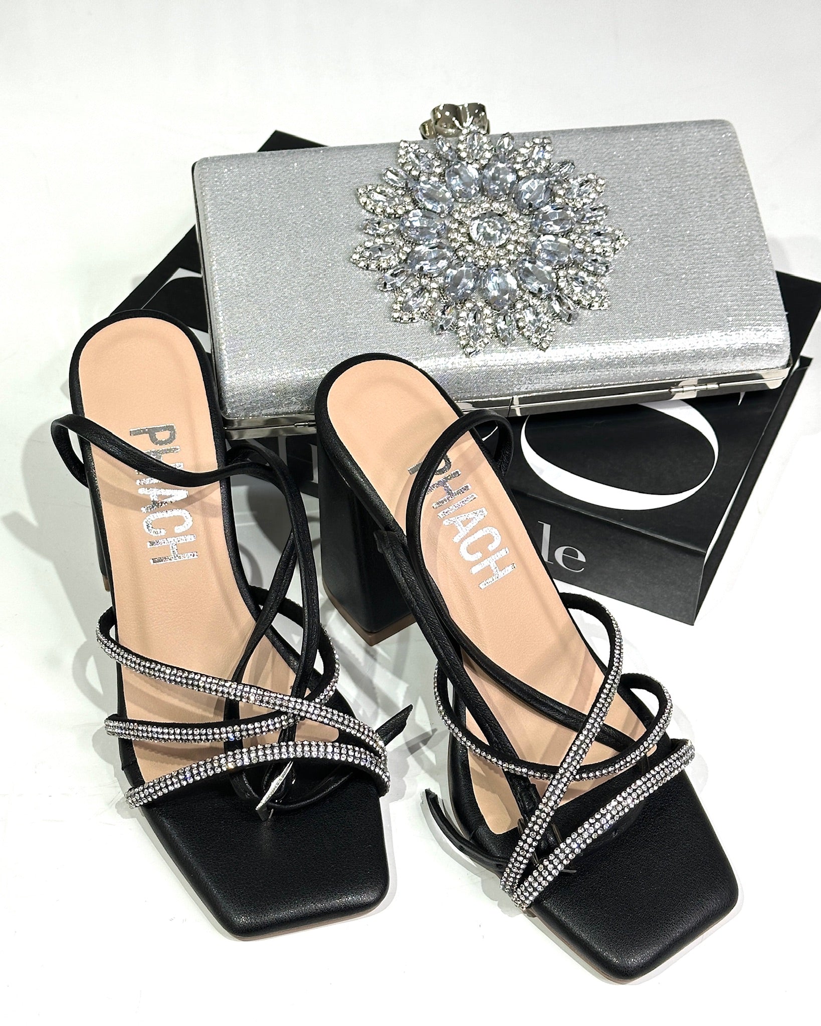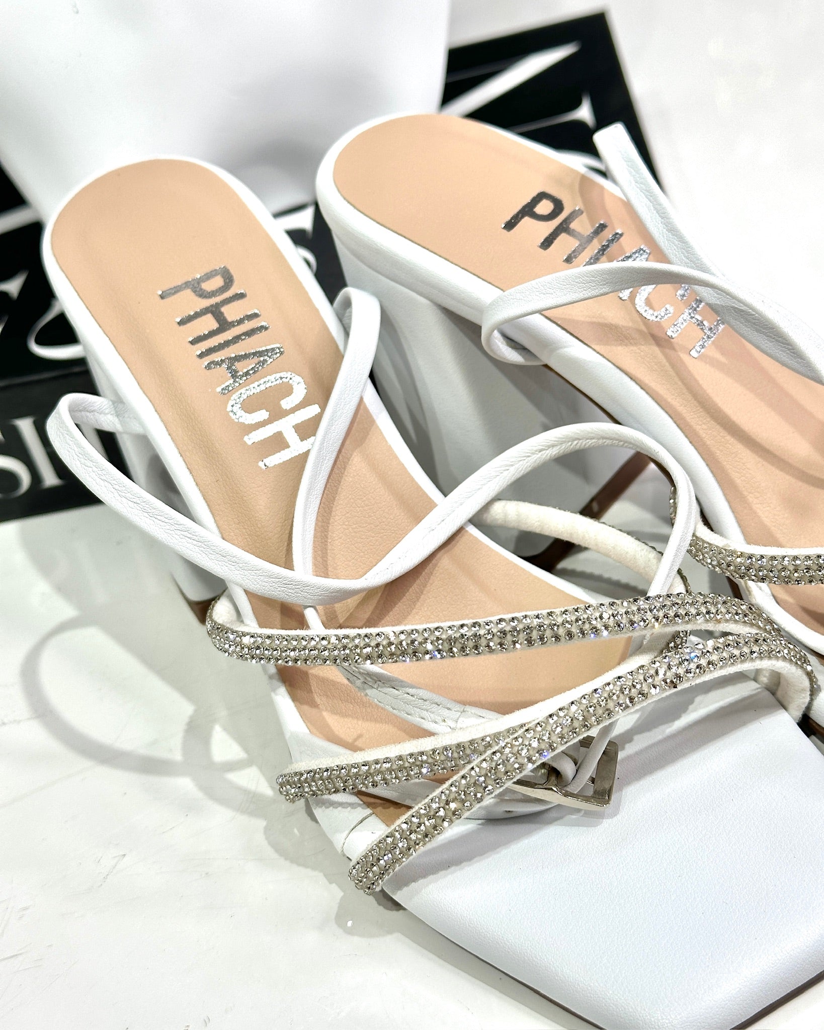Tacones PHIACH de líneas finas y diseño arquitectónico con brillos